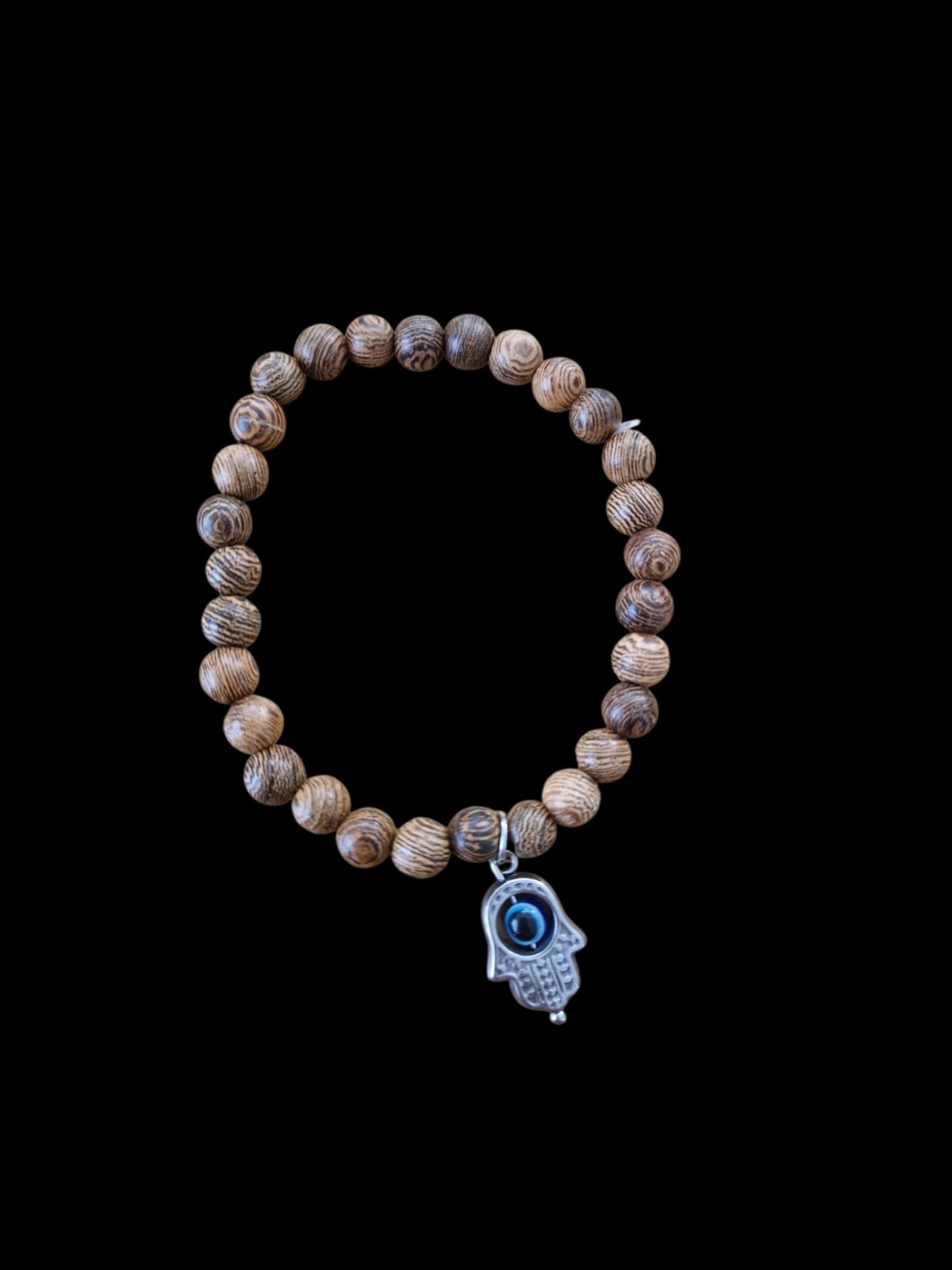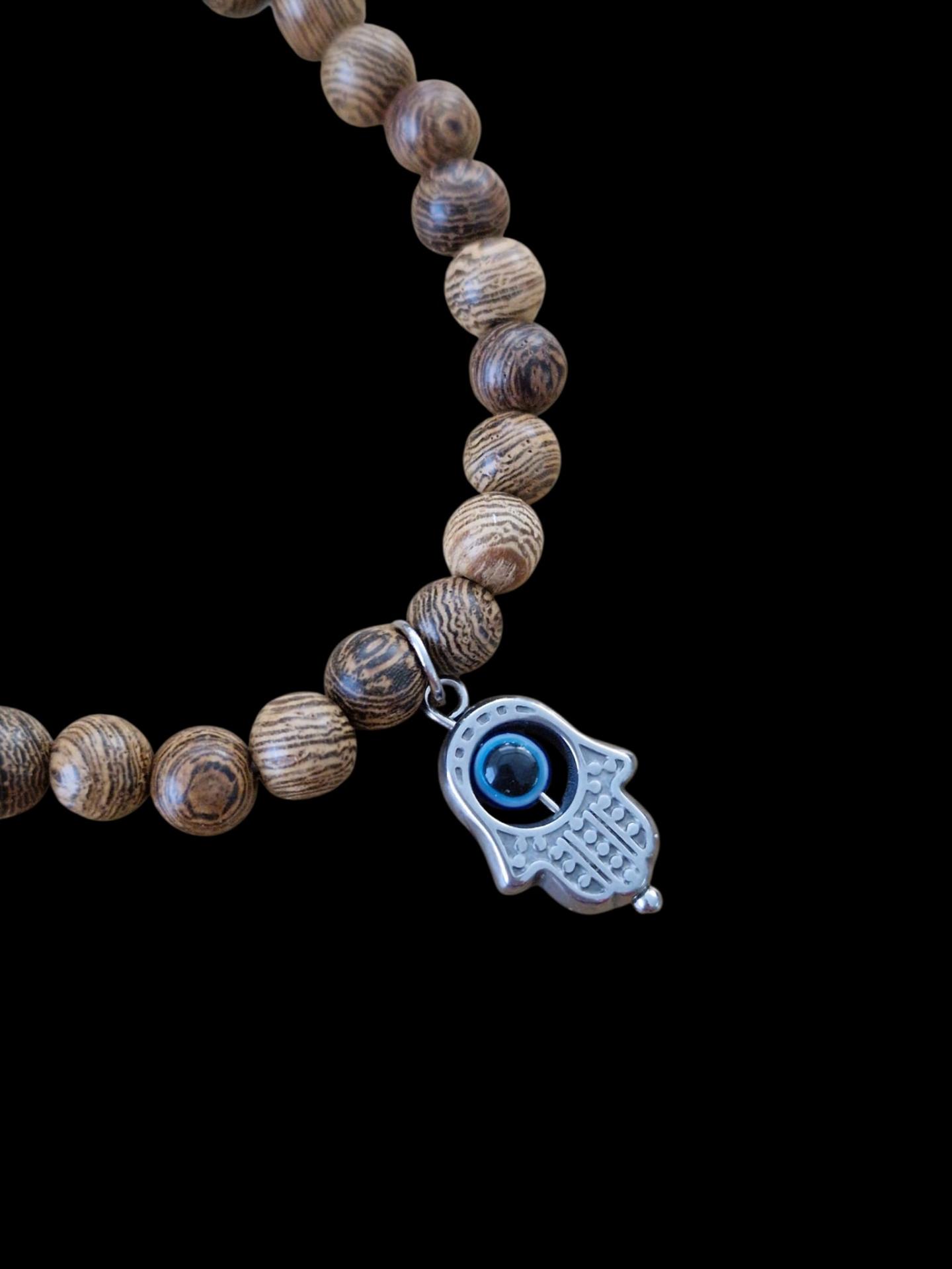 PULSERA ELASTICA EN PALO SANTO CON MANO DE FATIMA Y OJO TURCO EN ACERO INOXIDABLE.